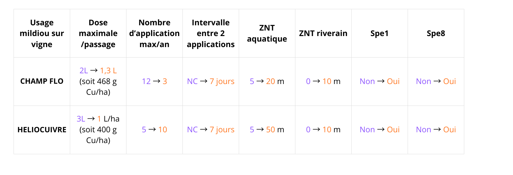 Tableau récapitulatif pour les deux substances autorisées (avant / depuis le 15/07/2025) :