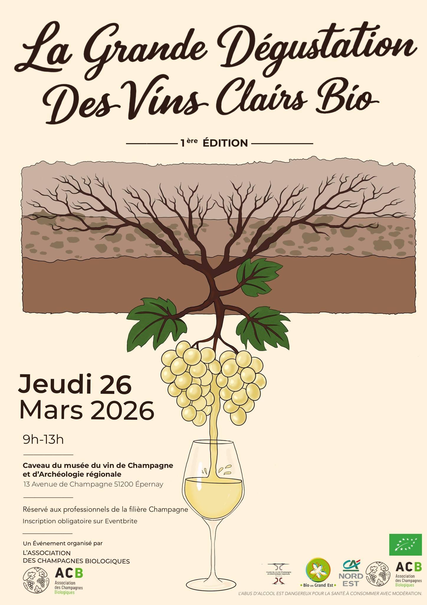 L’Association des Champagnes Biologiques est heureuse d’annoncer la 1ʳᵉ édition de la Grande Dégustation des Vins Clairs Biologiques de ses adhérents, qui se tiendra le jeudi 26 mars 2026, en matinée, au caveau du Musée du Vin de Champagne et d’Archéologie Régionale, sur l’avenue de Champagne à Épernay.