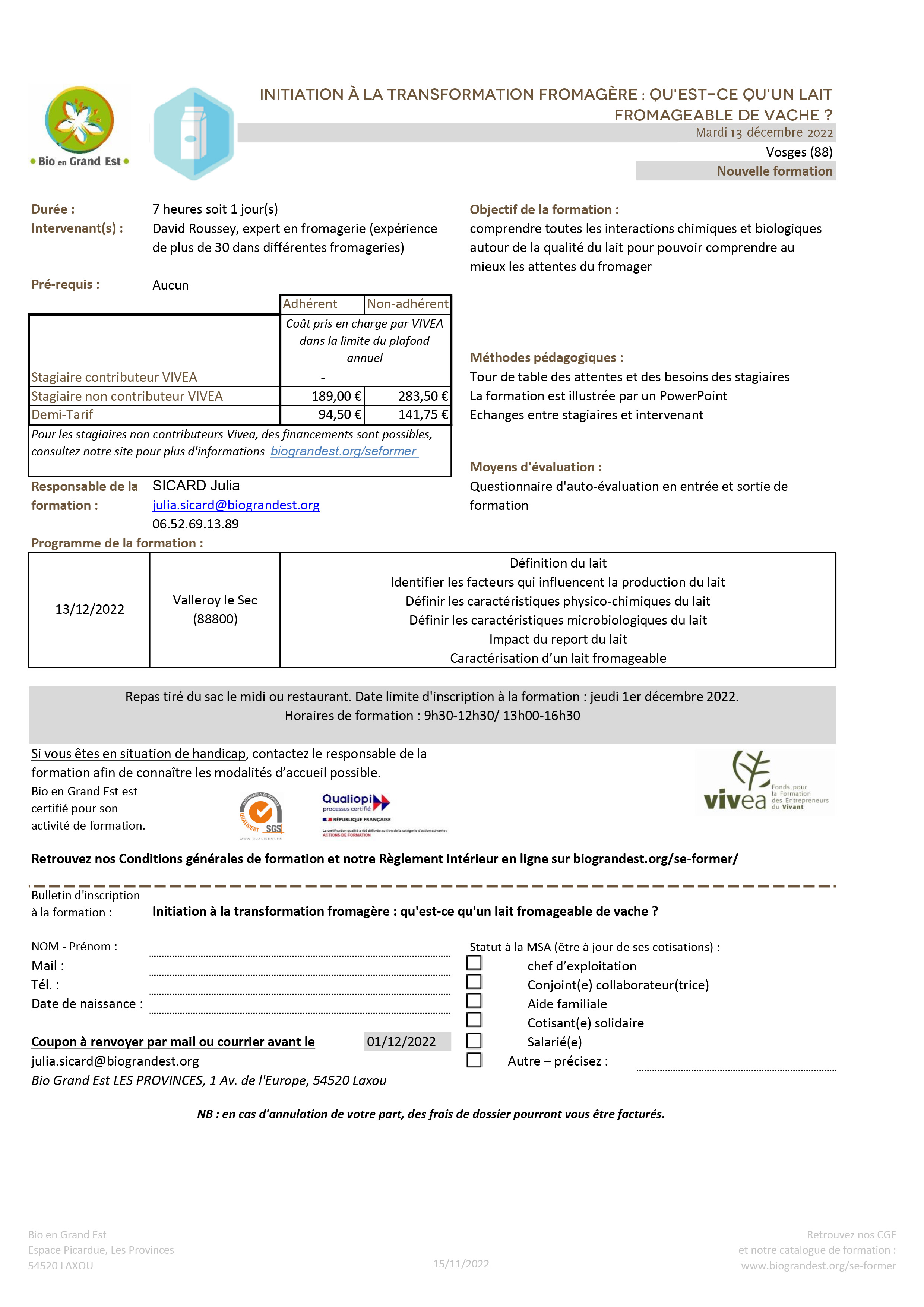 Si vous avez un projet de transformation à la ferme, venez travailler cette thématique sur 1 jour en décembre puis 1 jour en janvier, avec le partage d’expérience de David Roussey, expert en fromagerie (expérience de plus de 30 dans différentes fromageries). Le deuxième jour aura lieu en janvier : » Initiation J2 à la transformation fromagère : du lait au fromage, les étapes clés, les différents types de fromages »