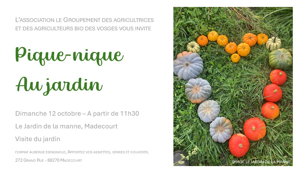 Le Groupement des Agricultrices et des Agriculteurs Bio des Vosges invite ses adhérents et adhérentes au pique-nique annuel de l’association