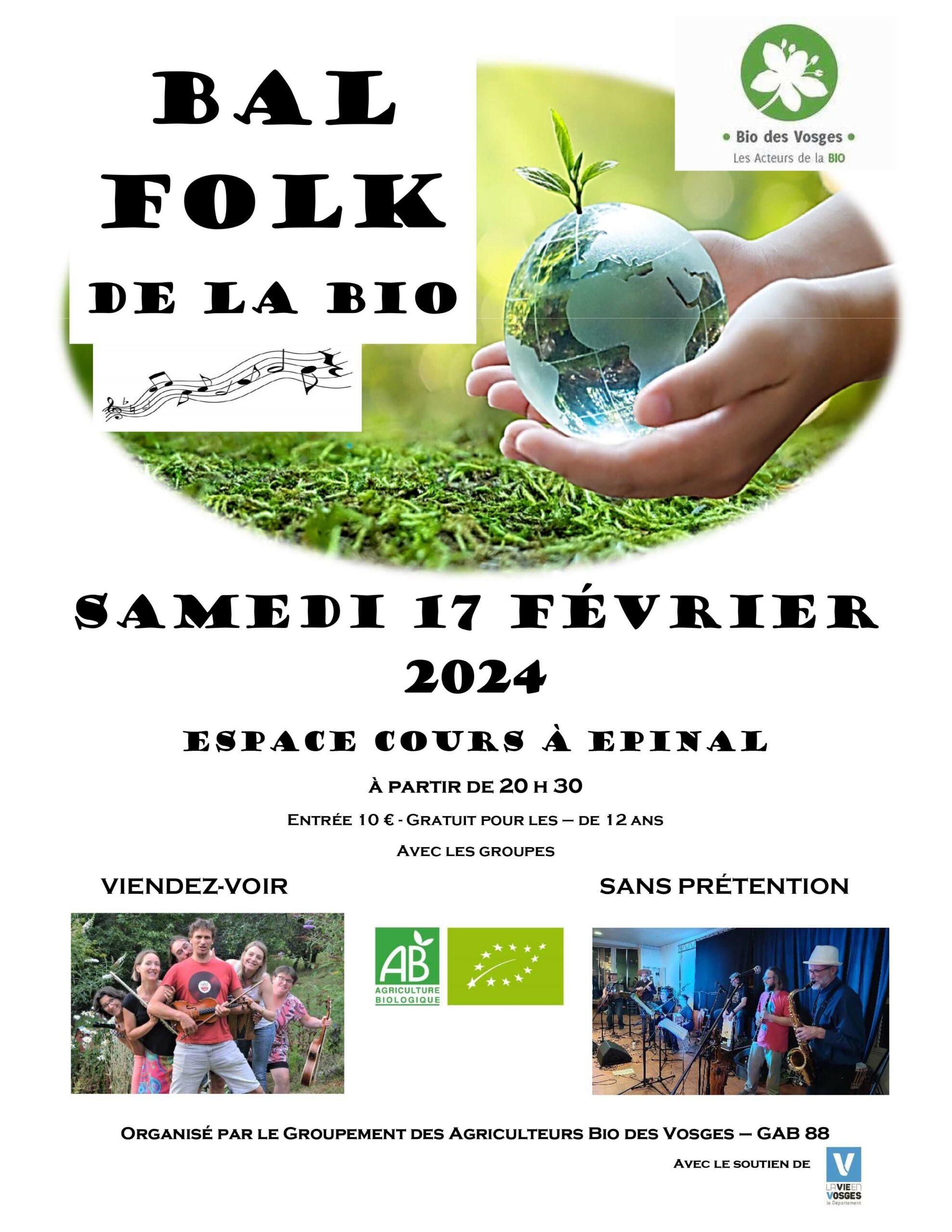ESPACE COURS avenue Gambetta, EPINAL, FranceLe GAB des Vosges et les organisateurs du bal folk de la bio vous invitent samedi 17 février 2024 à partir de 20h30 A l’Espace cours à Epinal avenue Gambetta Avec les groupes Viendez-voir et Sans prétention,