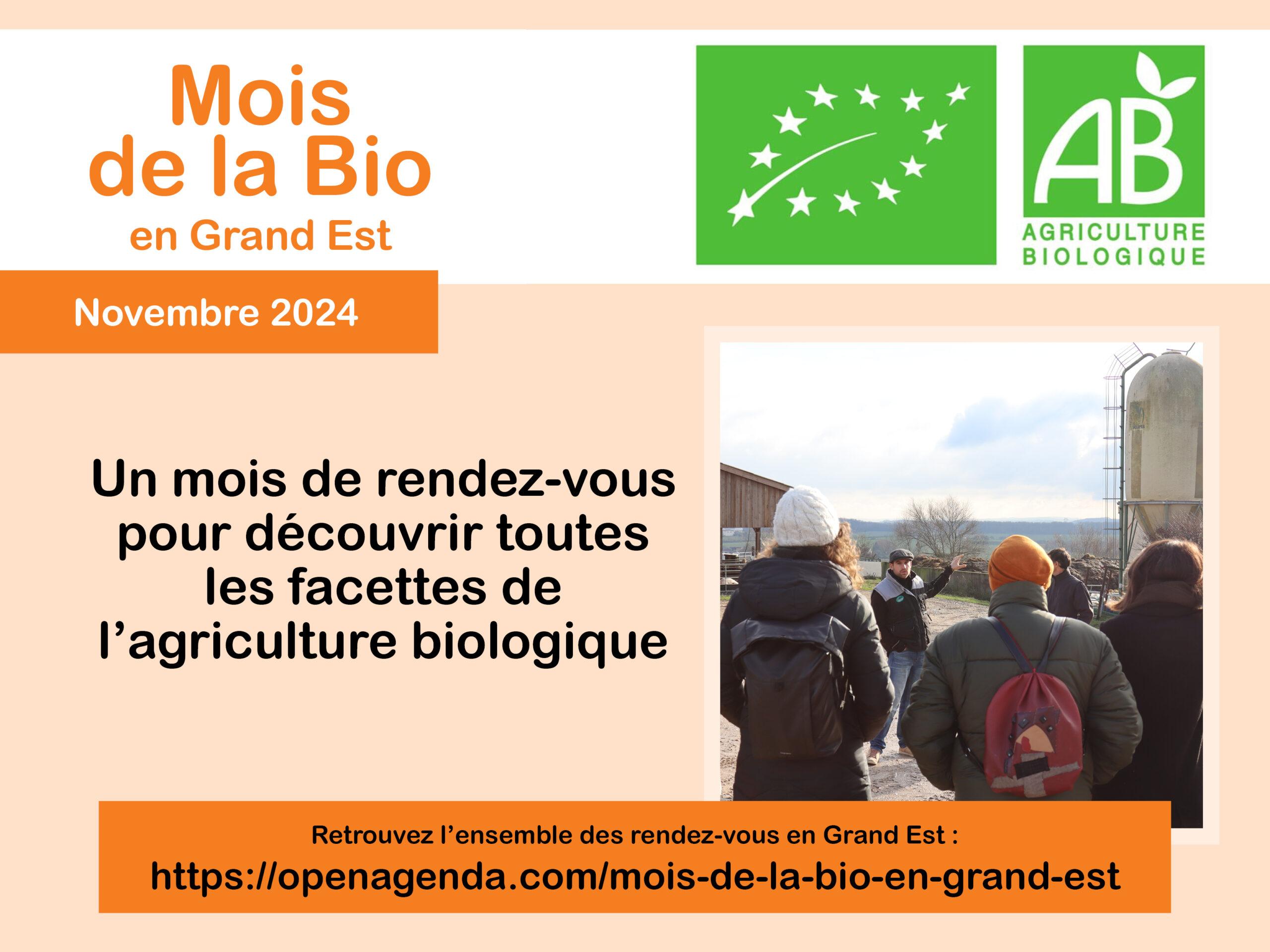 Le mois de novembre est consacré depuis plusieurs années à la promotion de l’agriculture biologique et de ses filières dans le cadre du Mois de la Bio. Les portes ouvertes, les réunions et les formations sont des opportunités pour échanger, partager des informations ou acquérir de nouvelles compétences. Sur le Grand Est, ce sont plus d’une 50aine de rendez-vous qui sont organisés.